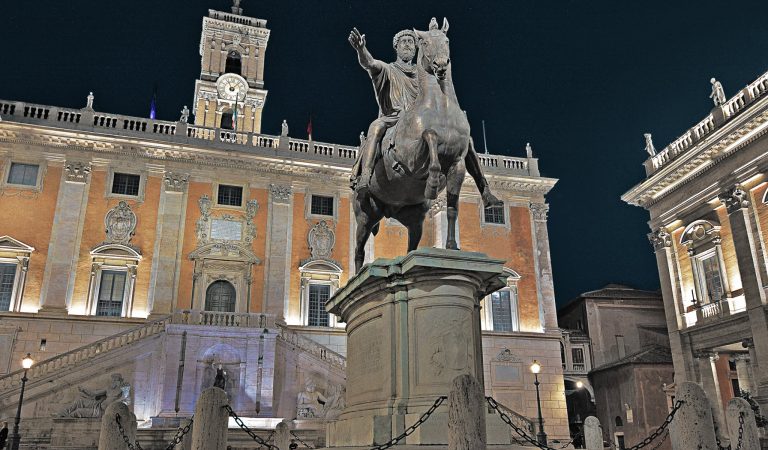 Il sole scende su Roma, creando romantiche sfumature di rosso e arancione nel cielo.